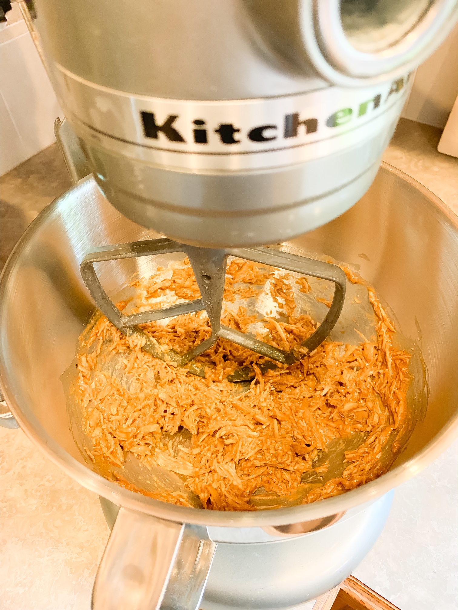 STEP 3: Pulverize your shredded meat. Mine was left over chicken from earlier in the week and for sandwiches I like it kind of chunky. But for this it it needs to be skinny little strands of BBQ goodness. I accomplish this by putting it my mixer and beating it for about a minute and that’s all it takes. You can do this with a fork in a bowl if you don’t want to bust out the heavy machinery.