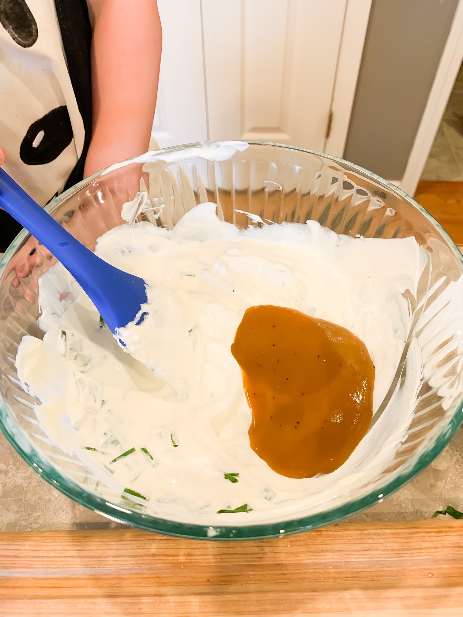 STEP 5: Mix together the “wet” ingredients. Sour Cream, Mayo. BBQ sauce and Chives in a separate bowl. This is a great step for your 4 year old to help with.