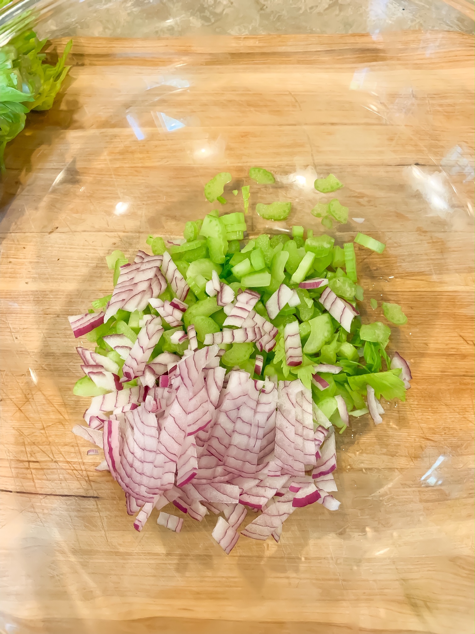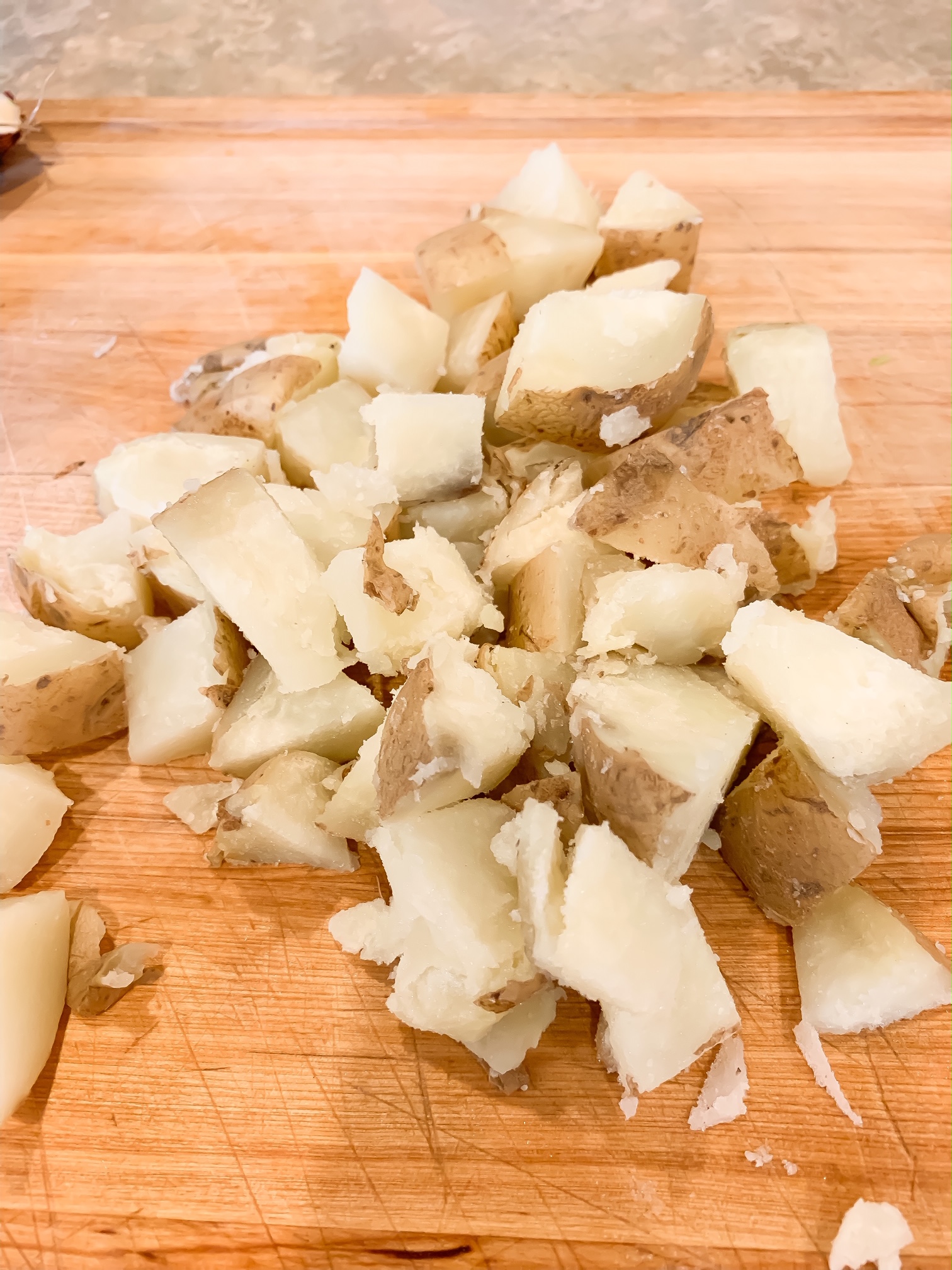 STEP 1: Dice your potatoes into 1″ or slightly smaller bite sized pieces. And toss together with your red onions and celery.