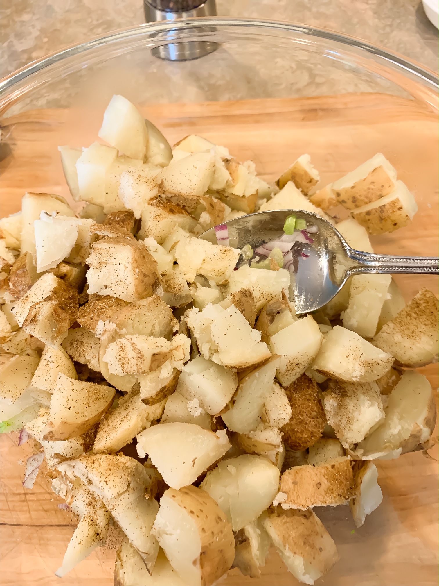 STEP 2: Sprinkle with celery salt and black pepper. This step in important. I think that seasoning the potatoes before you dress them separates the bad from the good potato salads. Potatos have no flavor…give it to them!