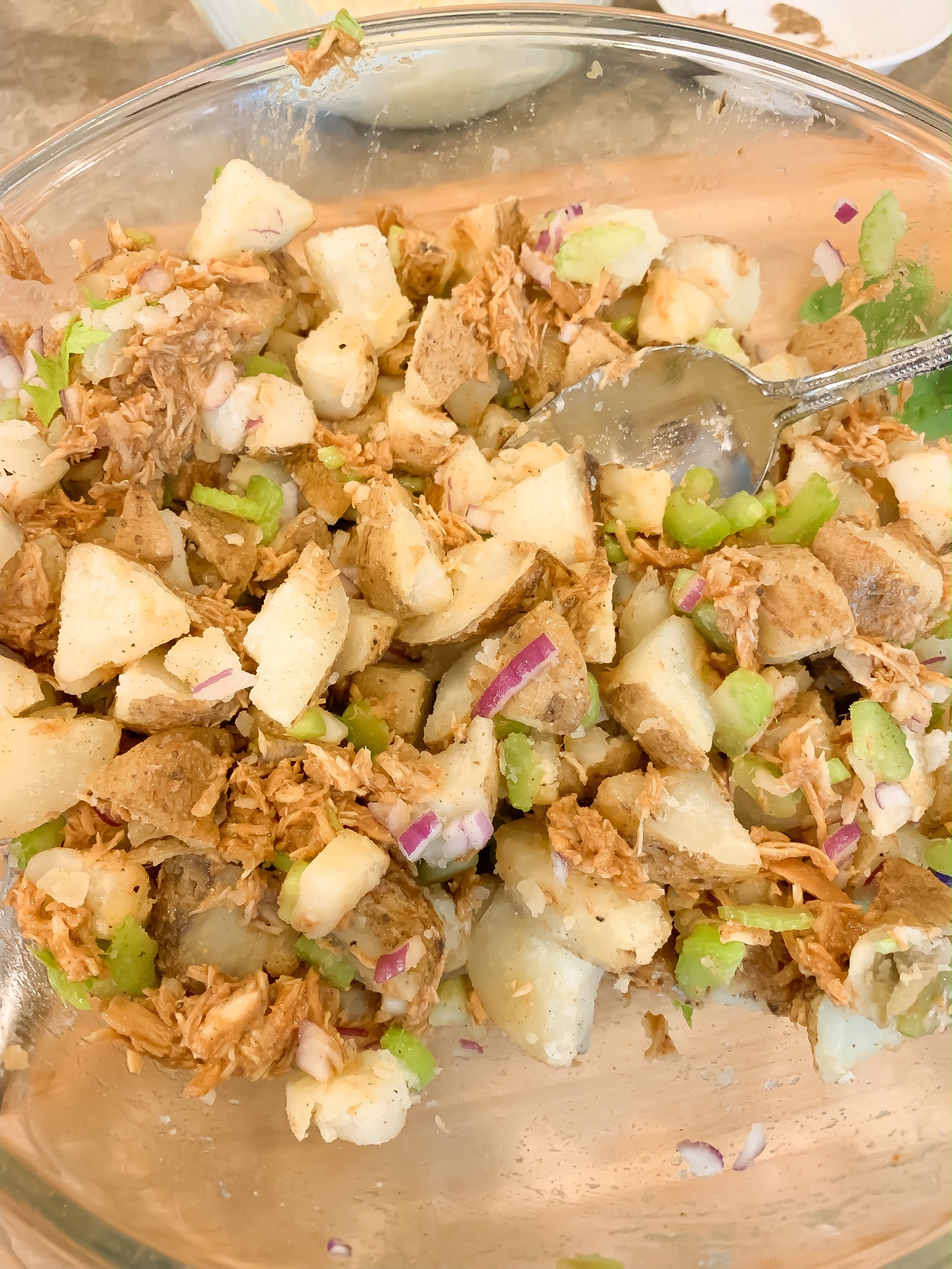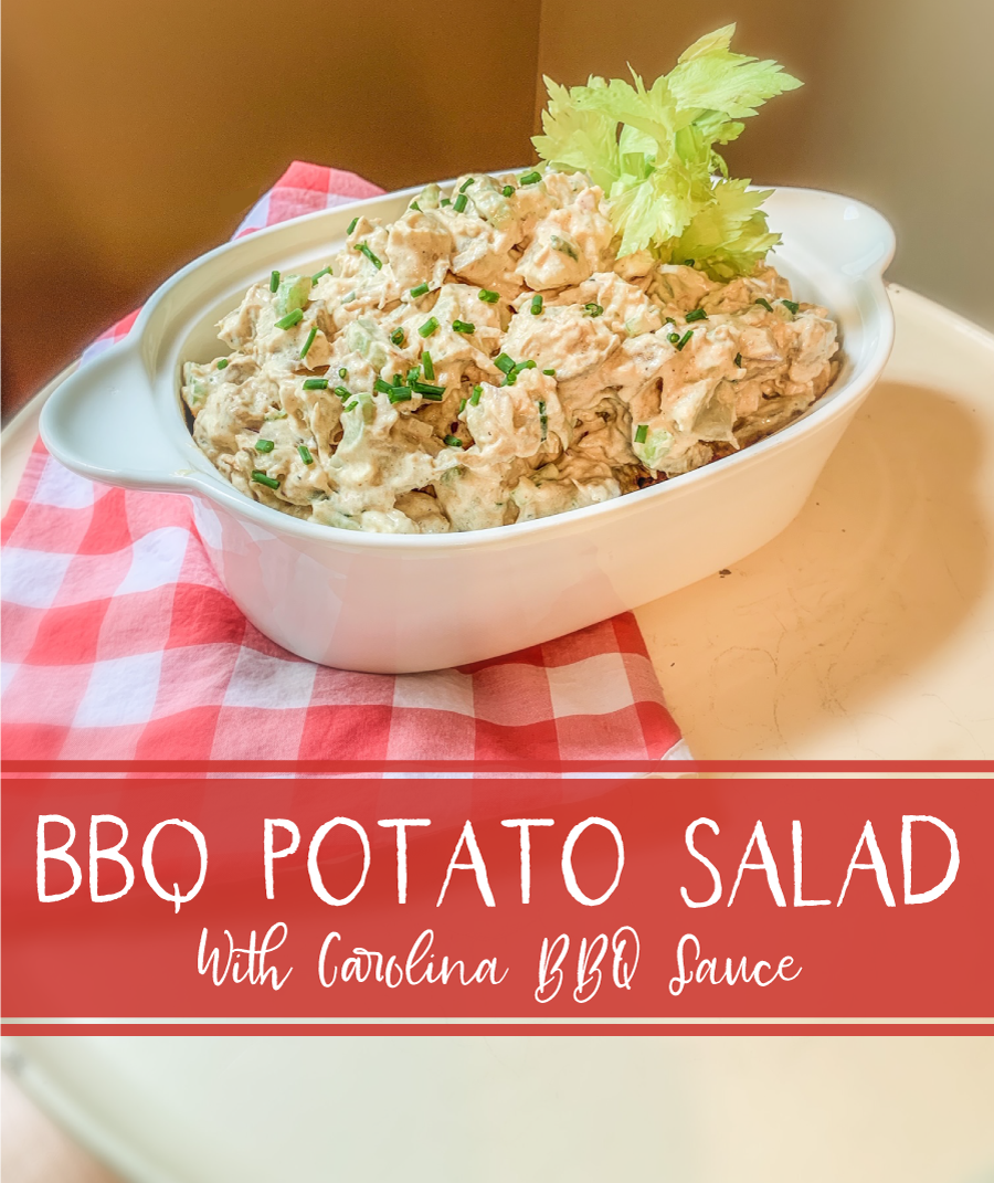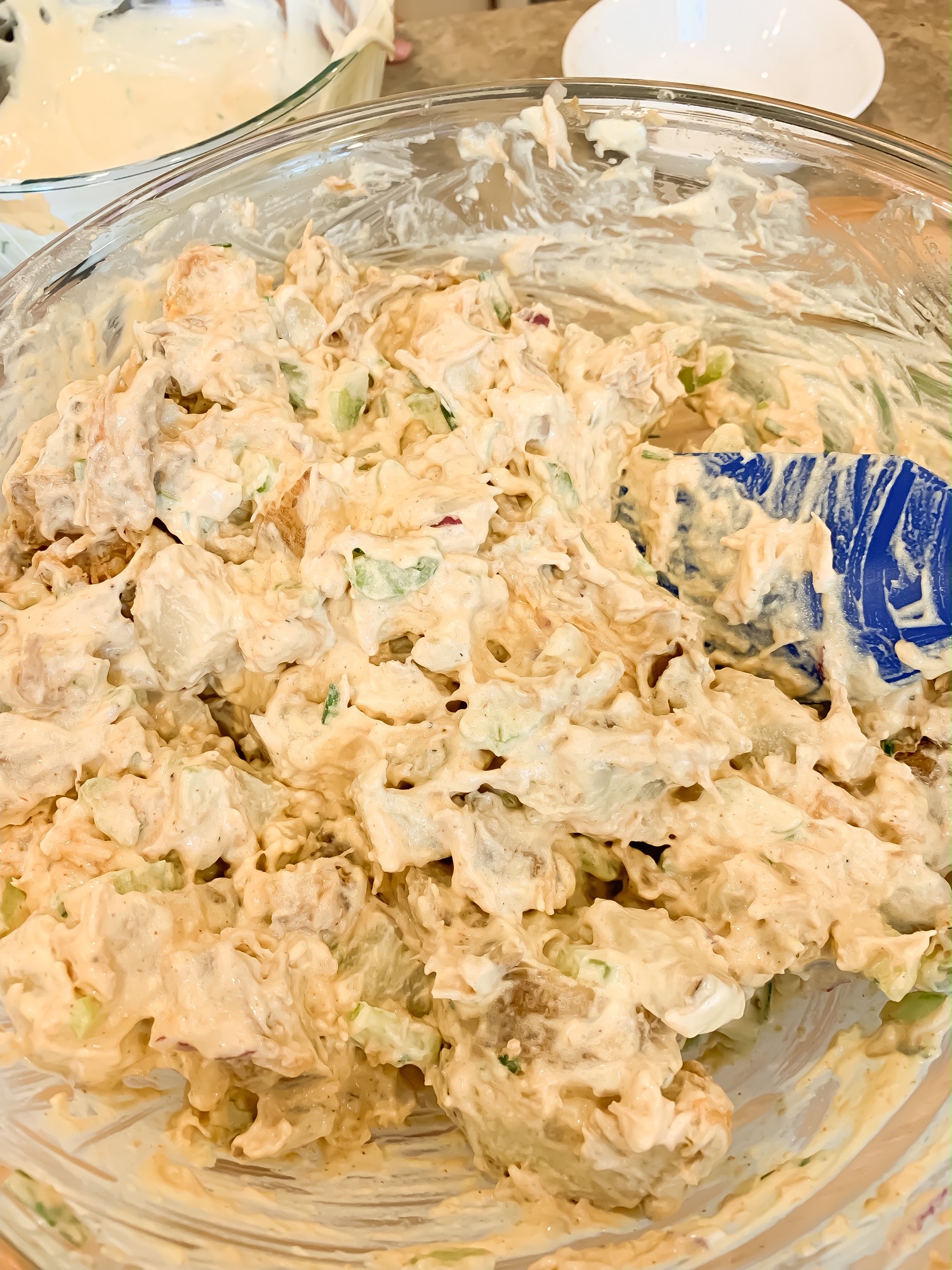 With all of that said…I went out on a limb…I created something new. I am usually the pasta salad queen, but I threw a curve ball today and for a friends BBQ and created this new potato salad favorite. It has a lot of the usual potato salad costars but a couple new ones as well. The superstar in this is the Carolina Mustard BBQ sauce that has been starring at me in my fridge door since I bought it a couple months ago on sale. One of those items you buy , use and love but it just doesn’t fit into your normal weekly regime.
